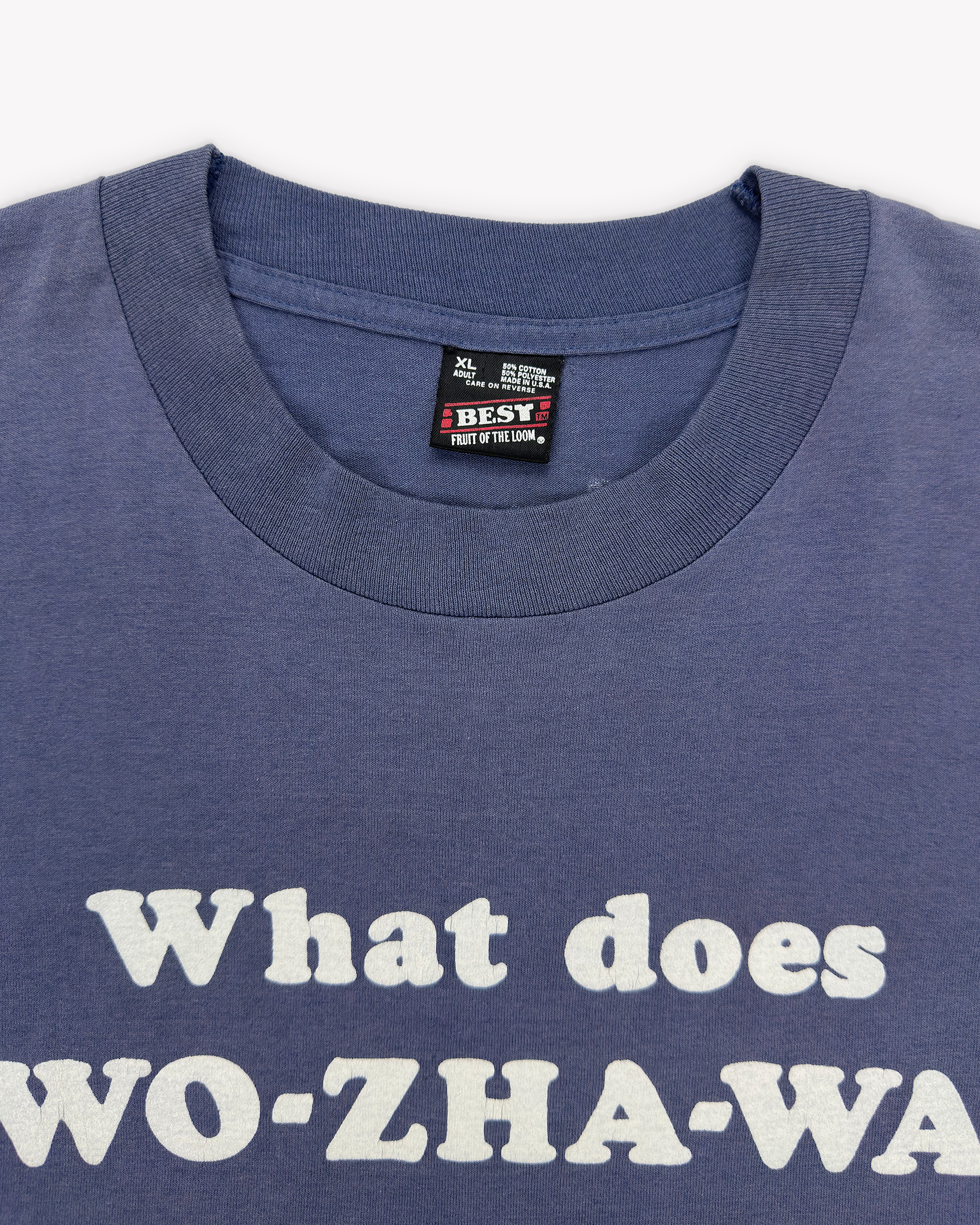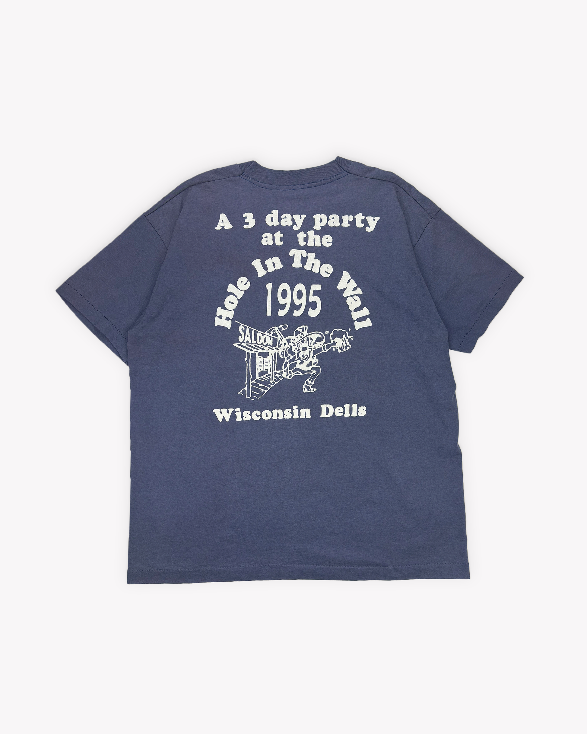 Super fun graphic to celebrate the 1995 Wo-Zha-Wa, an annual fall festival in Wisconsin Dells. Amazing colour, classic bubbly font, and a lovely back print. Printed on a 90s Fruit of the Loom Best 50/50 single stitch tee.