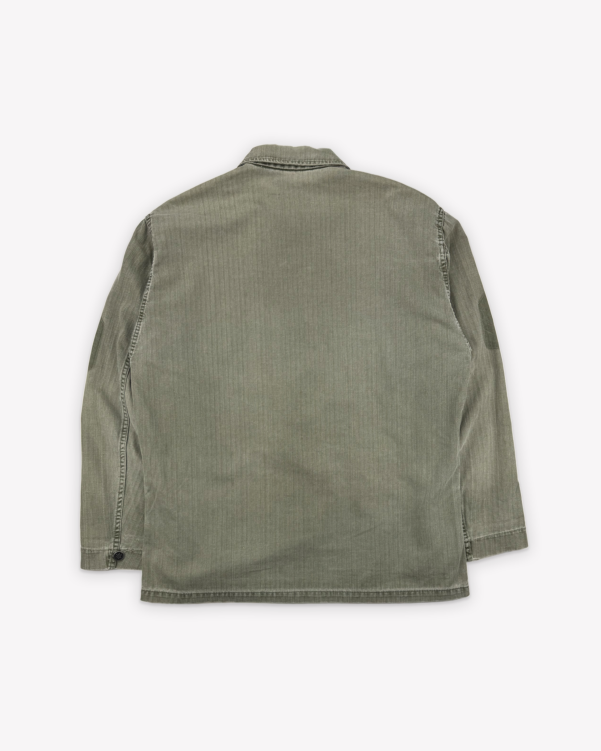 Third pattern HBT jacket from 1943 - big pleat pockets on the front. All 13 Star buttons are fully intact as is the original size tag in the neck. Incredible fading, colour is beautifully worn in with killer ghost patches on the arms and chest.