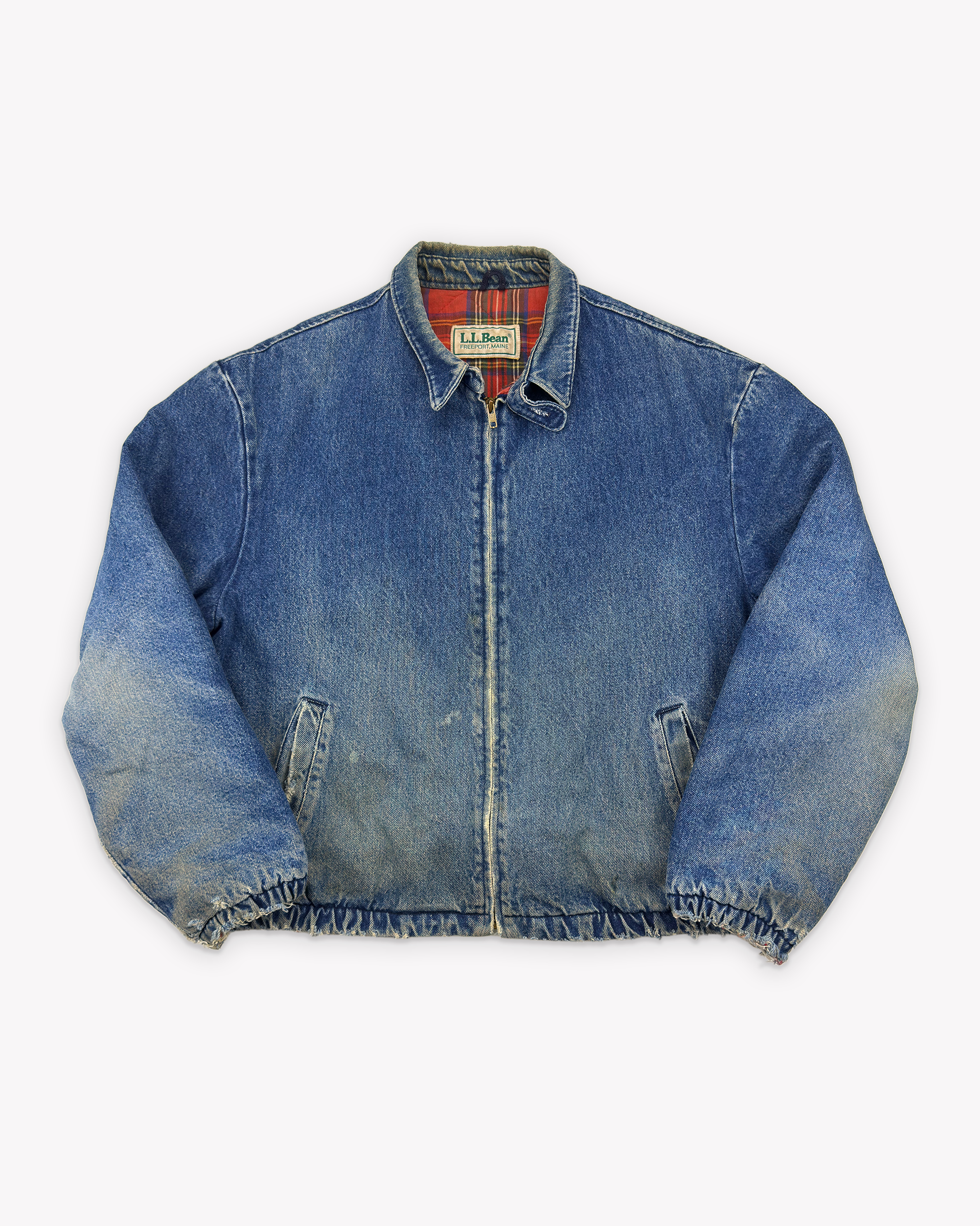 The colour and fading on this 80s L.L.Bean denim jacket is honestly perfect, it's thrashed but in the best way possible. Some of the best honeycombing we've seen on these sleeves. Killer red tartan lining, lovely smooth YKK zip and topped off with that cute little throat latch. Very cool, very nice.