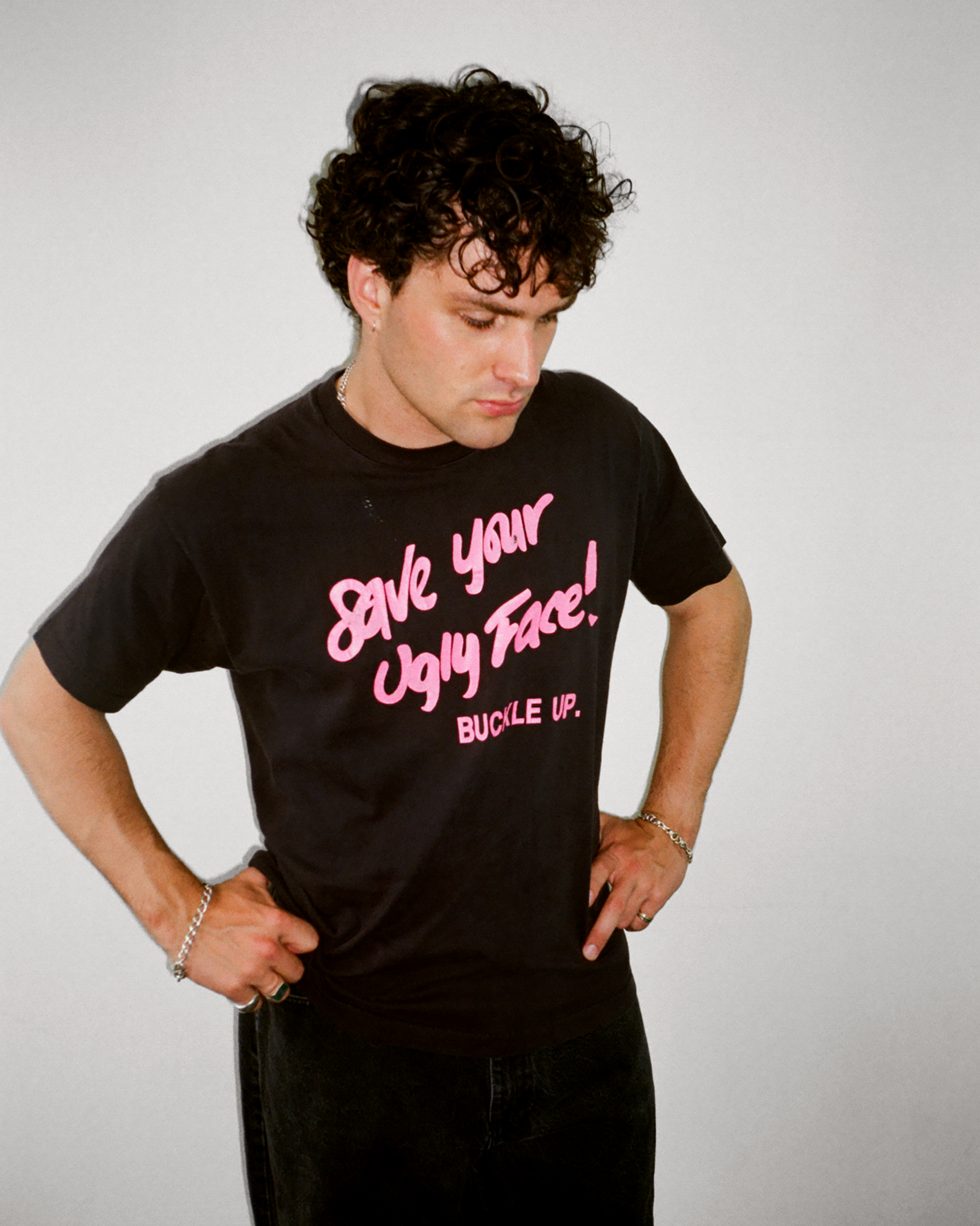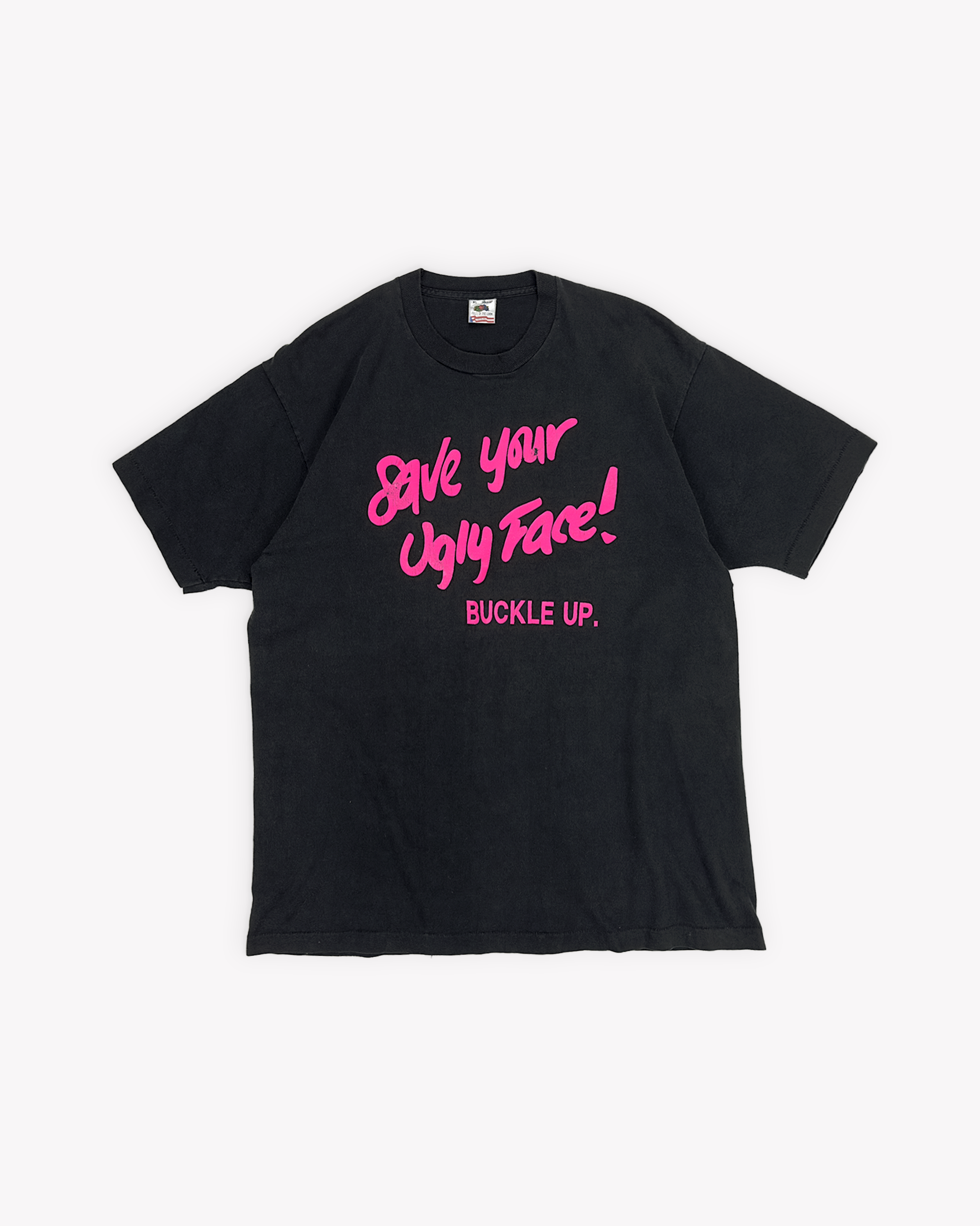 This tee speaks the truth - buckle up boys and girls! Killer pink graphic against the black. Fruit of the Loom single stitch.