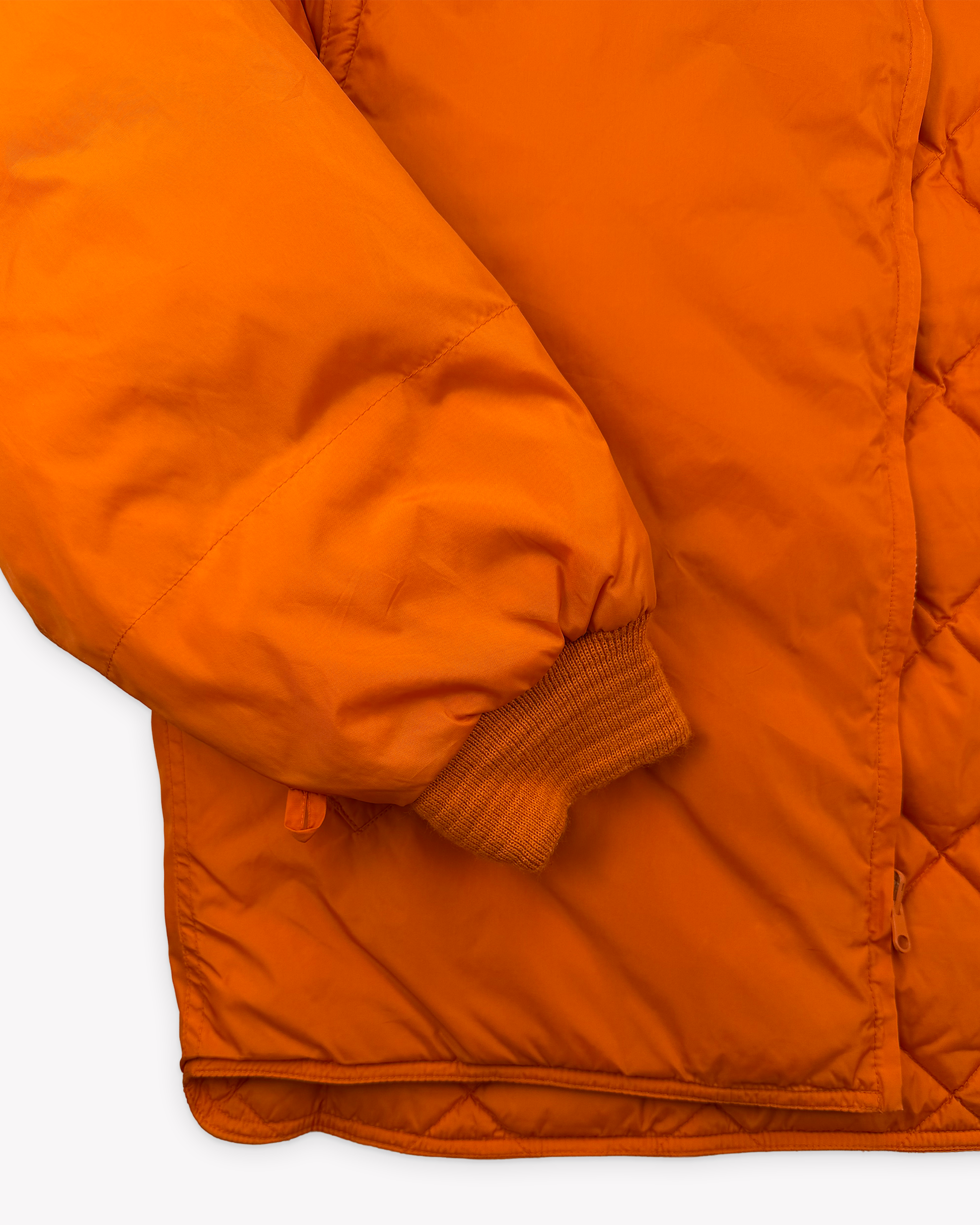 Need a jacket and a vest, but only got the budget for one? No stress - this 90s J.Crew jacket has zip off sleeves for those days when your arms just get too hot. Filled with 80% goose down and 20% feathers it boasts 550 fill power. Killer safety orange colour and classic green Oarsman neck label.