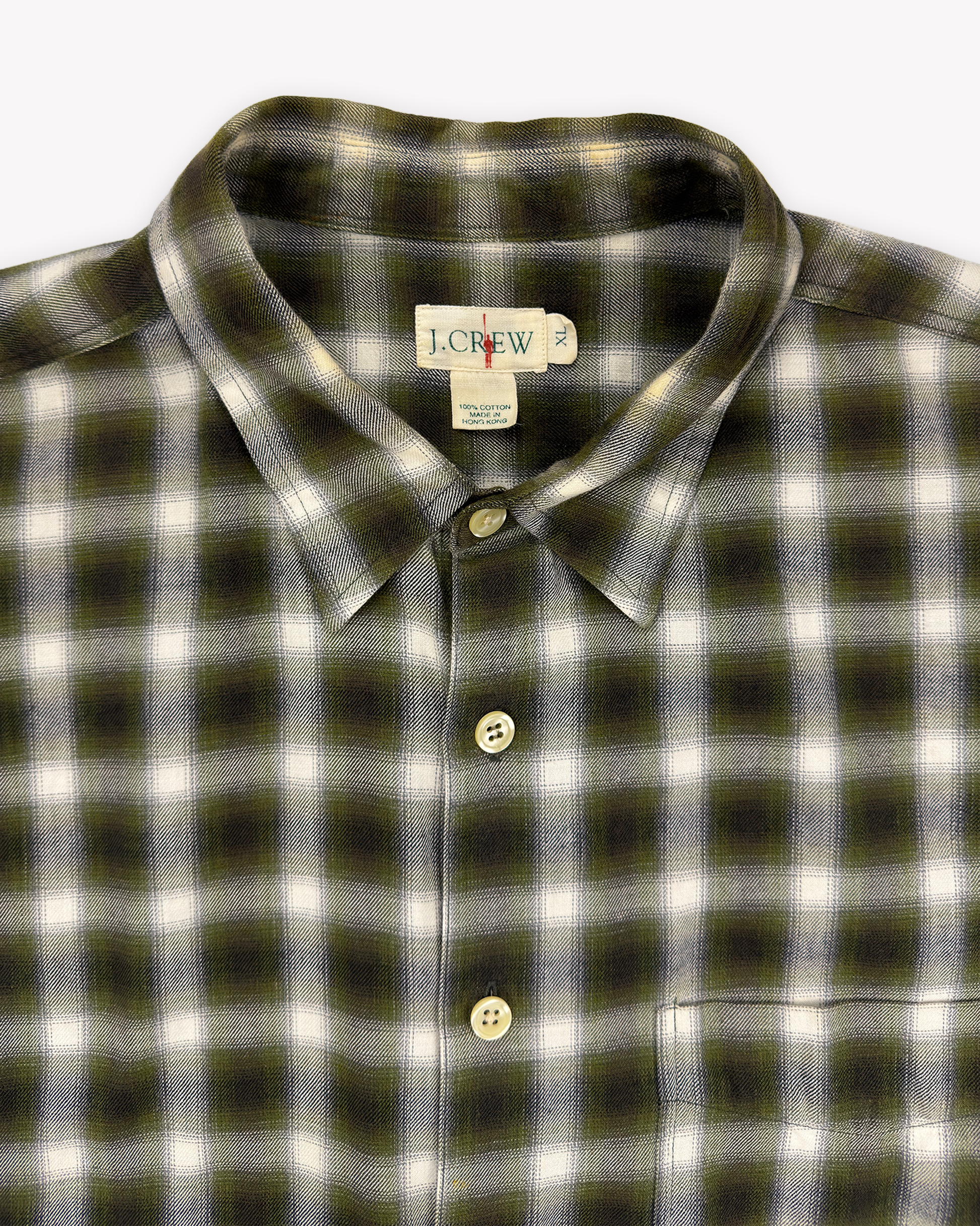 Killer 90s J.Crew shadow plaid shirt. The cotton is so soft and buttery feeling, a little lighter weight than your usual flannels. J.Crew Oarsman neck label.