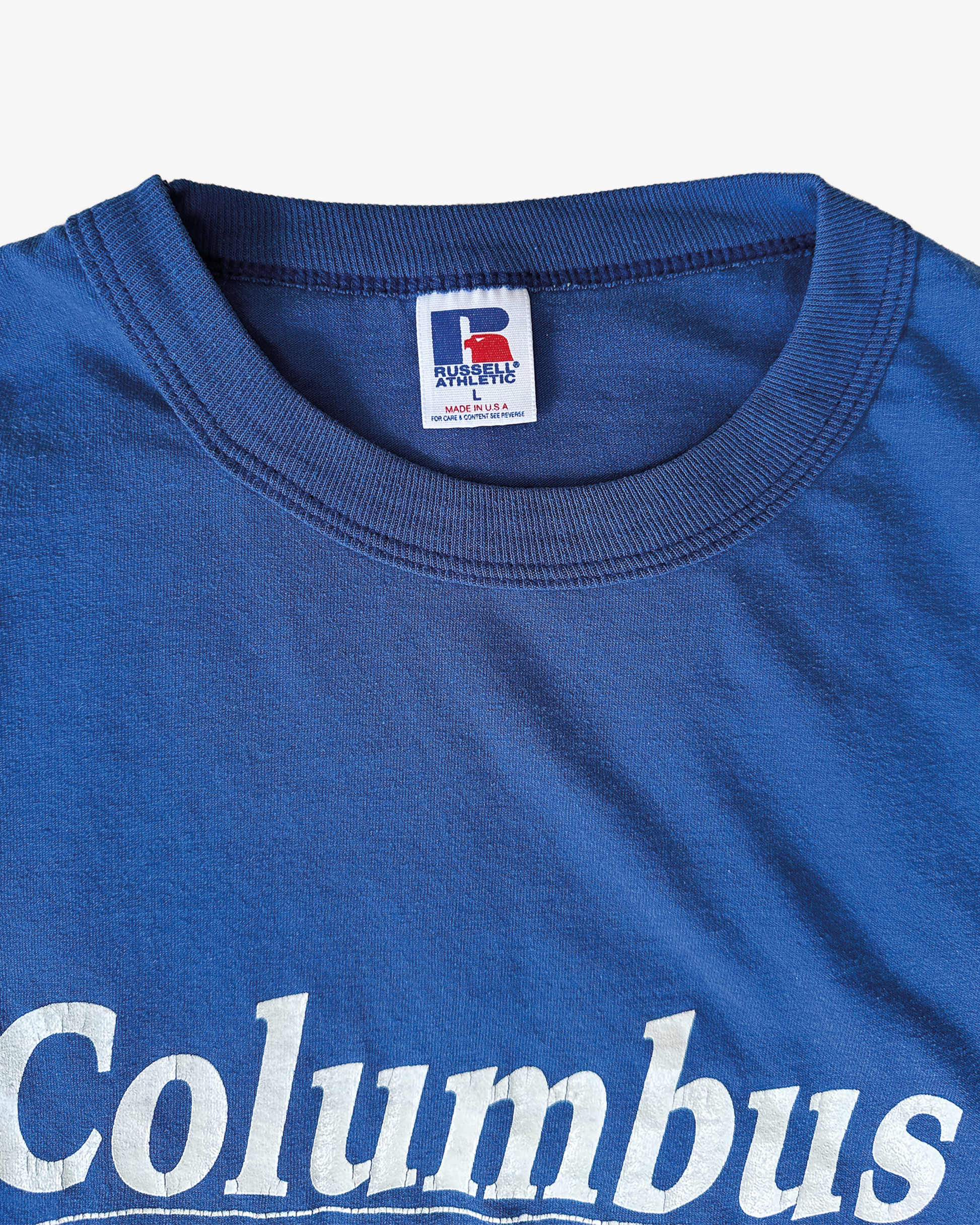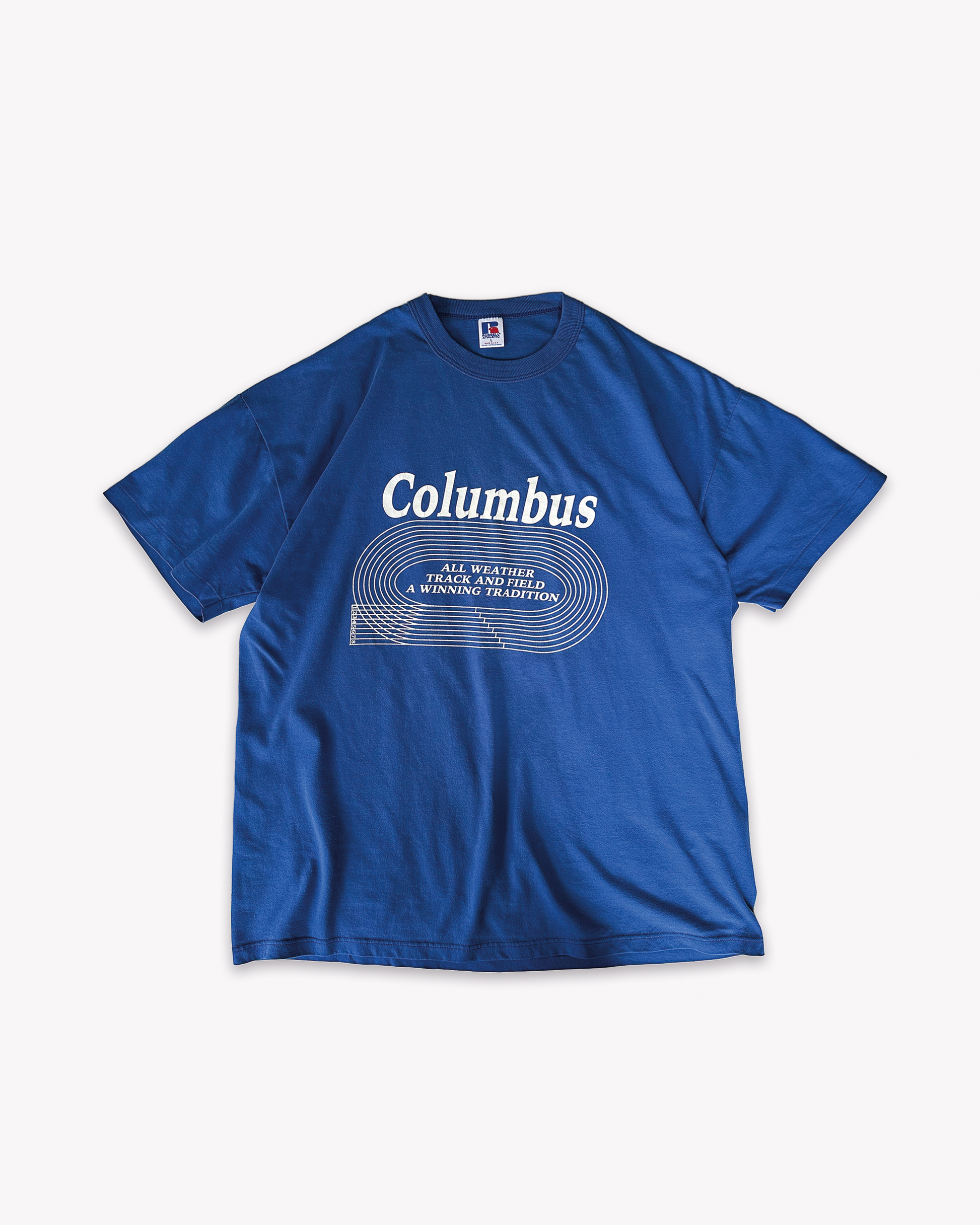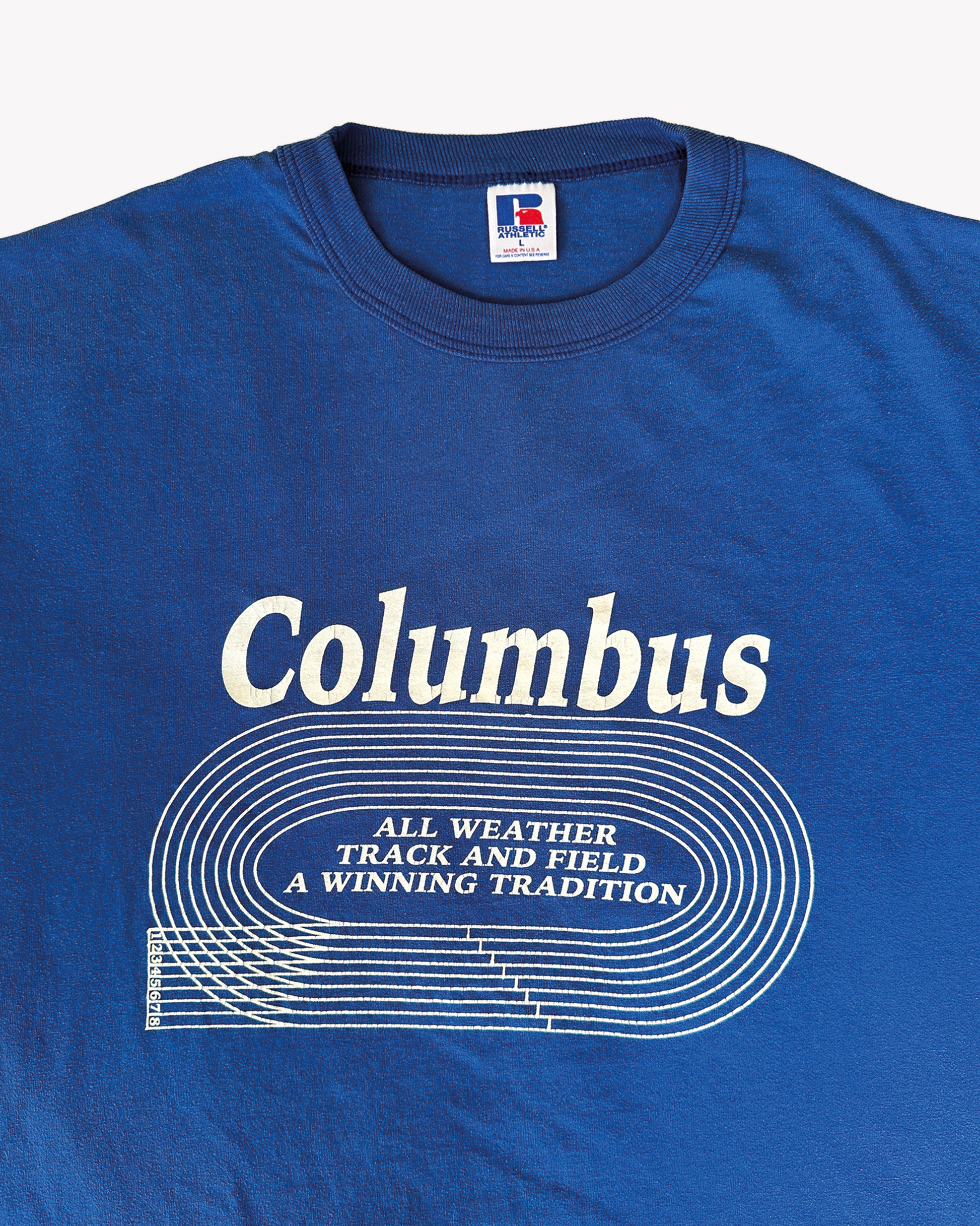 90s Russell Athletic 50/50 tee with sick Columbus Track and Field graphic. Made in USA. Signature Russell mounted collar, still solid as ever