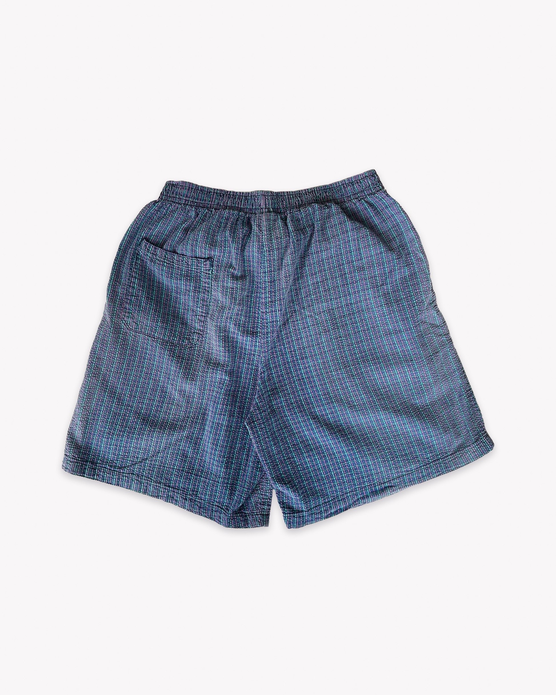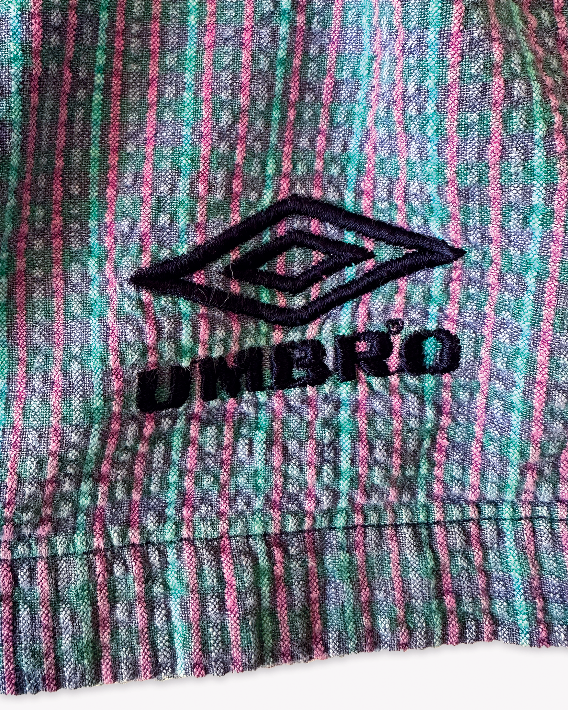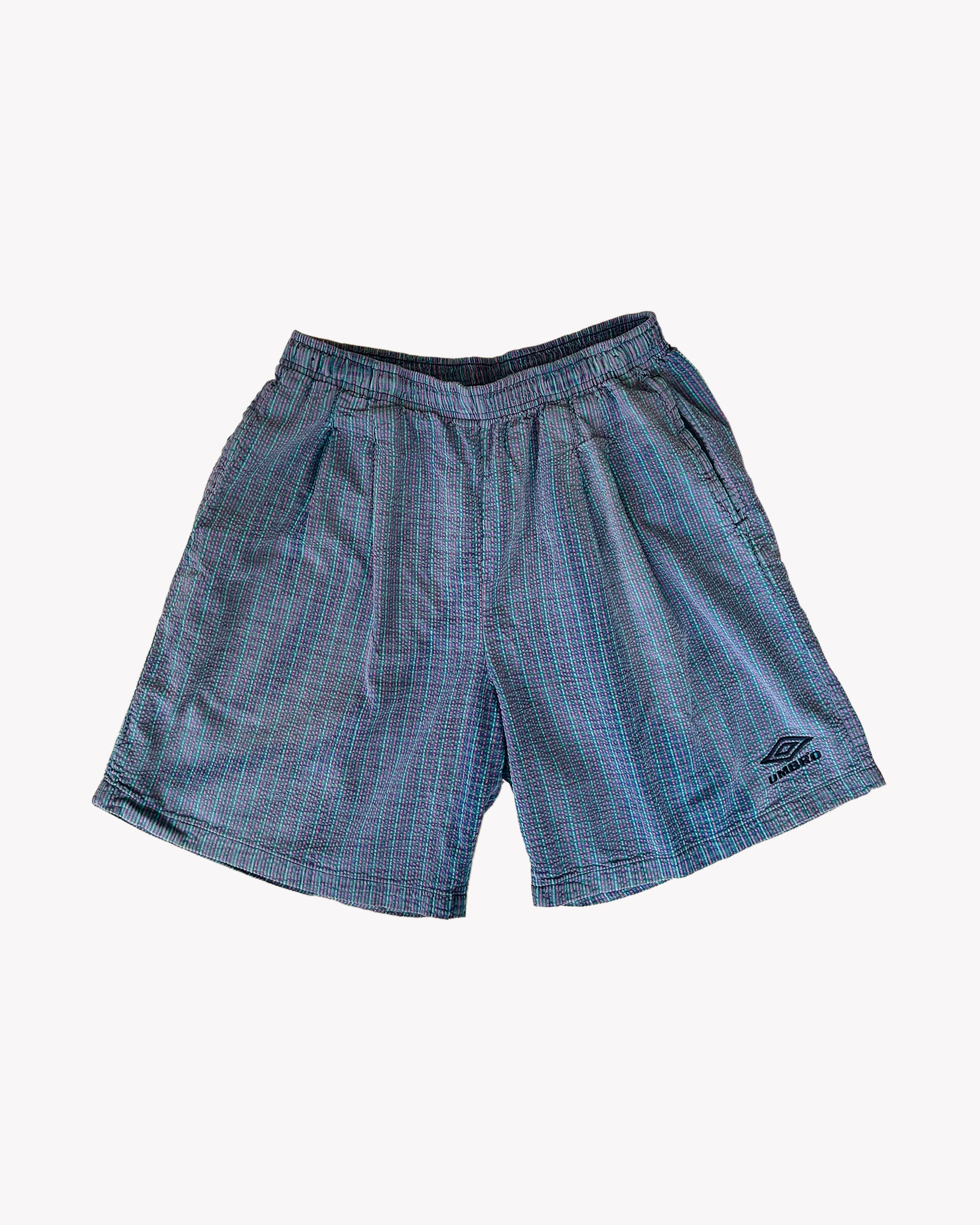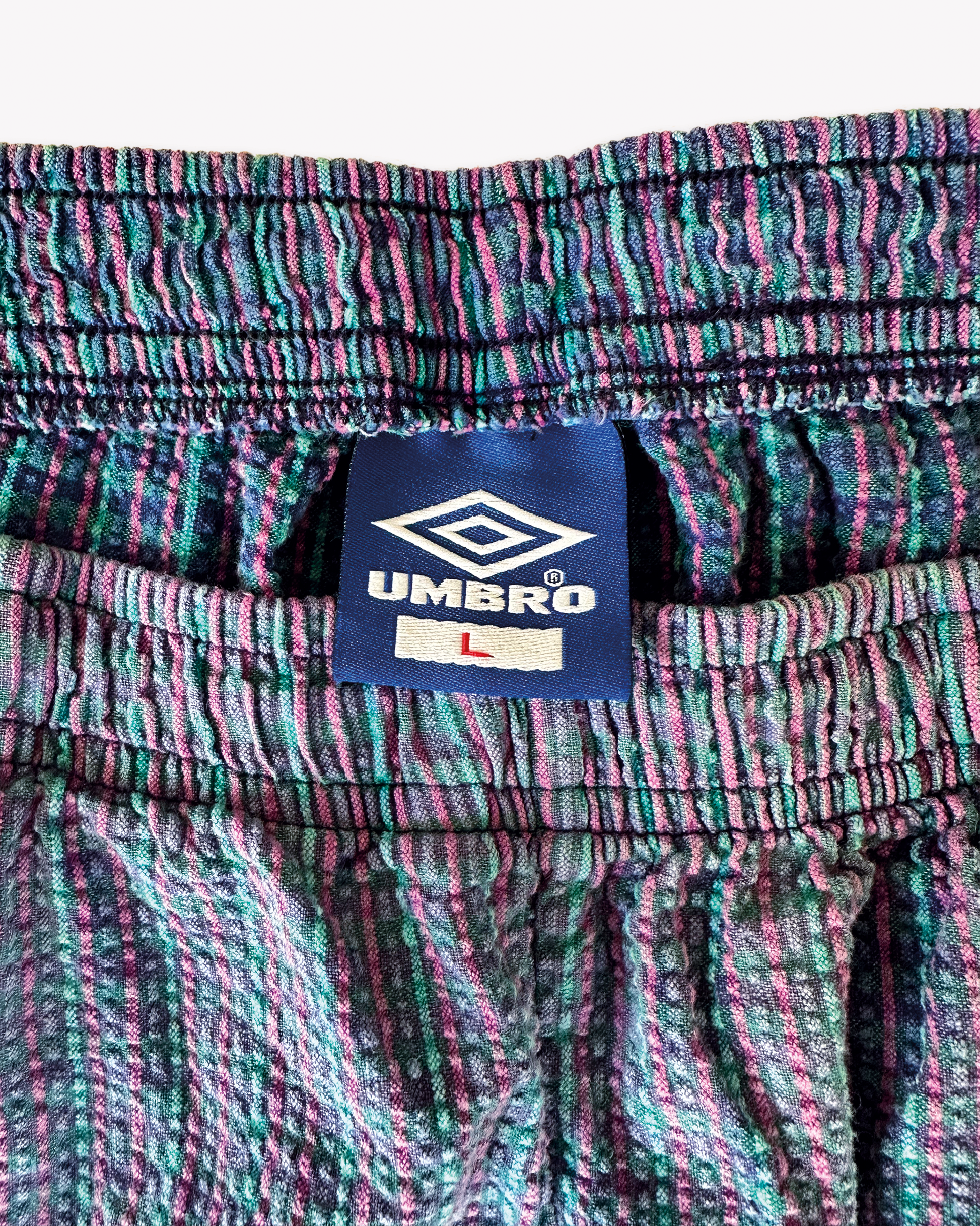 Wicked pair of Umbro shorts in a bad boy multicolour striped seersucker fabric. Double pleats. Patch pocket on the back